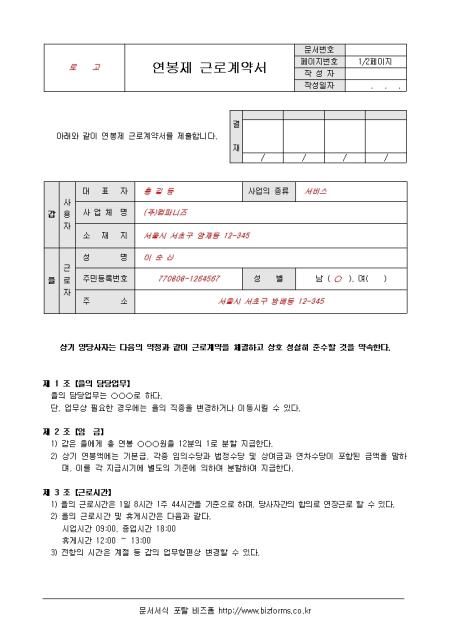 연봉제근로계약을 할 때 사용하는 계약서로써 사용자, 근로자 인적사항과 근로계약 내용으로 구성되었습니다.