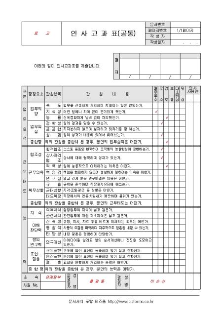 승진 및 승격 또는 개인상여등을 판단할때 사용되는 서식입니다. 직무지식, 업무속도, 업무의 정확도 등으로 구성되어 있으며 사원의 능력과 업적에 대해 정기적으로 검토하고 평가지도함으로써 자기개발과 업적 향상을 도모합니다.