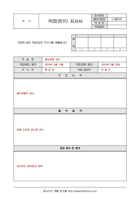 작업에 필요한 지시사항을 문서로 기록한 것으로써 작업날짜와 작업에 필요한 작업내역, 담당자, 결재란으로 구성되어 있습니다.