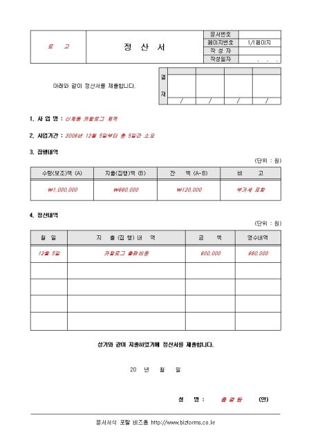 정산에 필요한 내용을 기록할수 있게 만들어 놓은 서식으로써 수령액, 지출액, 잔액, 정산내역 등으로 구성되어 있습니다.