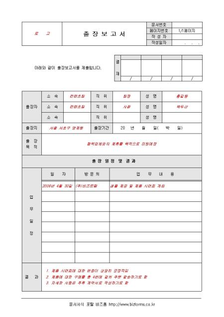 출장시 사용되는 문서로써 출장자, 출장지, 출장목적, 출장기간 등으로 구성되어 있습니다.