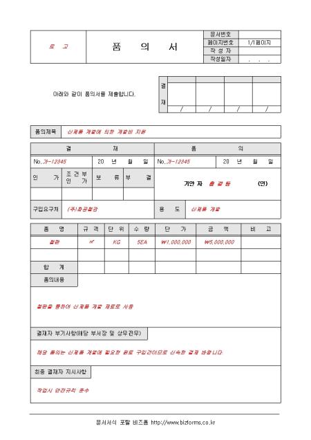 회사내 상사에게 의견을 제시할때 제출하게 되는 문서로써 품의내용과 최종 결재자의 지시사항을 기록할수 있도록 구성되어있습니다.