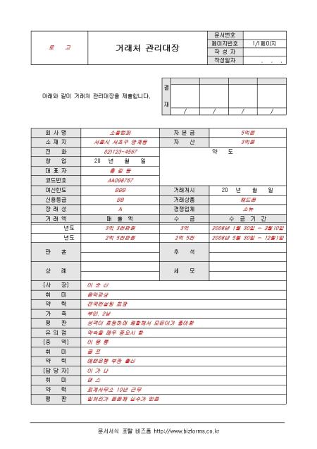 거래처에 관한 사항을 기록/관리하는 거래처관리대장입니다. 회사명, 소재지, 전화, 여신한도, 신용등급 등의 항목으로 구성되어있으며 담당자가 작성 관리합니다.