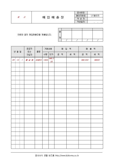 매입과 매출에 관한 사항을 기록/ 관리할 수 있는 매입매출장입니다. 품명, 거래내용, 매입액, 매출액 등의 항목으로 구성되어있습니다.