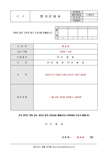 병가를 신청할 때 사용하는 병가신청서입니다. 신청자, 신청일자, 기간, 사유, 세부내용 등의 항목으로 구성되어있으며 본인이 직접 작성하여 제출합니다.